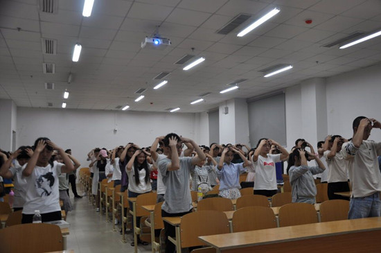 在互动学习环节,冉龙彪给同学们示范教授经络调整法和情绪调整法,并寄语同学们:心中有快乐,才会有爱,才会成功。