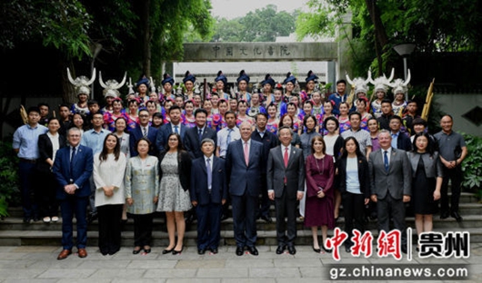 走进合一亭前的内院广场,黛瓦白墙的古院内色彩缤纷、歌声悠扬。在这里,安德鲁王子观赏了由学生们带来的充满民族风情与魅力的苗族舞蹈、侗族大歌等节目,并饶有兴致地了解了贵州少数民族组成、民俗等情况。