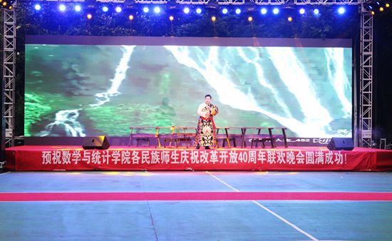 学院党委骆科扬书记向晚会致辞:今晚是一个好日子,数统学院近500各民族师生齐聚一堂,共同庆祝改革开放四十周年。1978年12月,党的十一届三中全会召开,中国共产党用改革开放的雄伟气魄把中国带入了一个波澜壮阔的崭新时代。四十年来,中国发生了天翻地覆的巨变,经济建设成就卓著、综合国力极大提升、人民生活显著改善。中国特色社会主义进入了新时代,党的十九大提出了我国现代化建设分两步走的战略部署,目标已经明确、蓝图已经绘制、号角已经吹响,数统学院各民族师生要牢记教导、奋发有为,为实现中华民族伟大复兴的中国梦贡献青春和智慧。