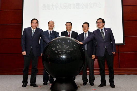 刘晓凯、蒙启良、左定超、陈坚、李建军共同为“贵州大学人民政协理论研究中心”揭牌。