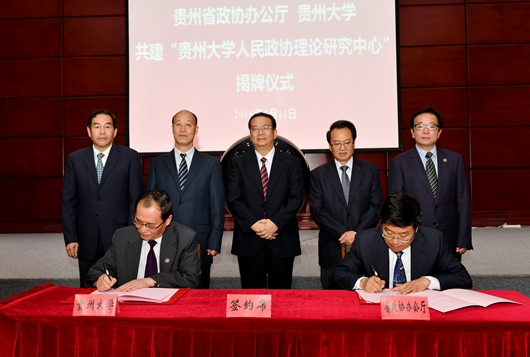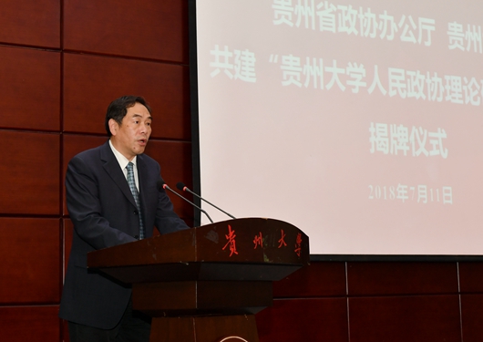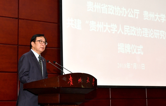陈坚讲话。他说,成立研究中心就是要把习近平总书记关于加强和改进人民政协的思想学深学透,做到真学、真懂、真用。贵州大学在理论研究方面有人才、有经验、有基础,推进省政协与贵州大学的有机结合,有利于人民政协理论研究更加透彻,有利于贵州大学理论研究多出成果、多出亮点。他希望,双方通过精诚合作,做到高起点谋划、认真选题,集中力量、重点突破,以独到见解体现出研究的思想性、引领性,努力把研究中心打造成我省理论创新高地、人才培养基地,以理论的深入研究更好指导实践,推动我省人民政协事业不断向前发展。