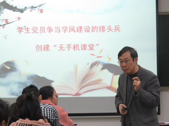杨静为大家讲述第二个主题——学生党员争当学风建设的排头兵,创建“无手机课堂”。