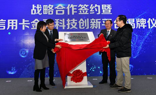 金道超、中国工商银行牡丹卡中心专家王鸿、周曦、VISA 国际卡组织大客户关系管理部副总经理林长青共同为“工银信用卡金融科技创新平台”揭牌。