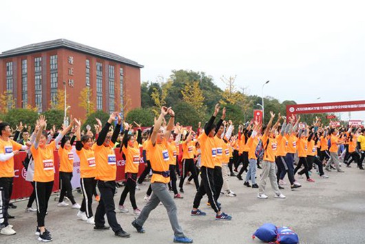 竞赛组的选手和体验组的选手先后进入跑道等待。随着赛前发枪枪声想起,比赛拉开帷幕。穿着参赛T恤,一张张青春的脸庞蓄势待发。一声枪响后,竞赛组、体验组、嘉宾组共三千人依次从我校阅湖广场出发,途径谨正楼、雅文楼、育贤广场等27个站点回到起点,全程共5公里。