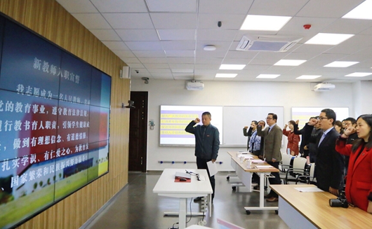 “我志愿成为一名人民教师,忠诚党的教育事业……”严肃的会场内,在王红蕾的领誓下,120名新进教师列队站立,举起右拳,跟诵誓词。