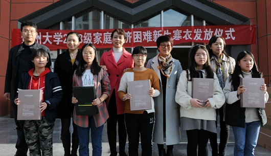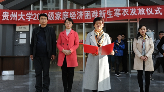 贵大新闻网讯 12月3日,2018级家庭经济困难新生寒衣发放仪式在我校西校区阳明学院举行。校党委副书记令狐彩桃出席仪式,学生资助管理中心、阳明学院相关负责人及30名学生代表参加仪式。