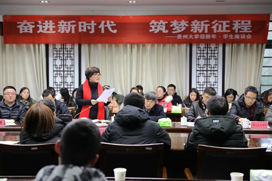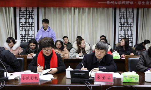 贵大新闻网讯 12月29日,我校“迎新年•书记校长与我话成长”学生座谈会在行政楼第一会议室举行。校领导宋宝安、令狐彩桃出席会议,学生工作部、研究生工作部、教务处、学生资助管理中心、招生就业处、校团委、保卫处、后勤保障服务部等职能部门负责人以及来自各学院的本科生、研究生代表参加座谈会。