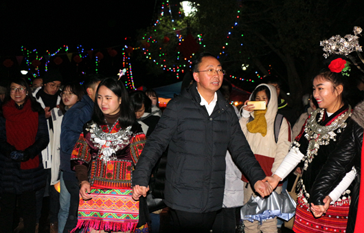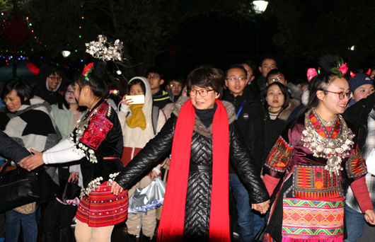 在丰富多彩的游园活动中,校领导们边走边和活动中的师生亲切攀谈。在仿真电子篝火前,校领导和身着水族服饰吹着芦笙、敲着铜鼓的学生一起踩着节拍跳舞,悠扬的乐器音、簌簌的银饰响平添了节日的热闹氛围。