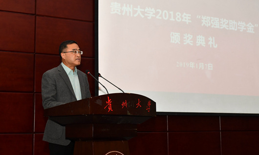 陈鸣明高度评价了郑强教授对贵州教育事业、贵州大学发展所做的重要贡献。他认为,设立“郑强奖助学金”,充分体现了郑强教授的崇高思想境界和家国情怀。他希望更多的爱心企业、社会人士继续关心支持贵州发展,勇于承担社会责任,为贵州教育事业添砖加瓦,为贵州脱贫攻坚贡献力量;希望贵州大学进一步完善郑强奖助学基金管理办法和评定办法,真正管好、用好“郑强奖助学金”;希望获奖同学心怀家国、感恩社会、奋发有为,弘扬社会主义核心价值观,努力成长为担当民族复兴大任的时代新人。