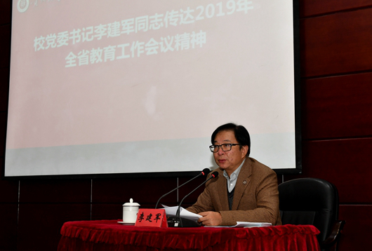 校党委书记李建军传达了2019年全省教育工作会议精神。2019年全省教育工作会议于3月4日召开。会议以习近平新时代中国特色社会主义思想为指导,对标对表党中央、国务院重大方针政策,对标对表省委、省政府以及教育部的工作部署,总结2018年全省教育工作,研究部署2019年教育工作任务。