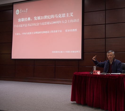 李建军表示,张异宾教授的报告,对我校师生在中国特色社会主义新时代,学习好马克思主义原理有重要的指导意义。习近平总书记在纪念马克思诞辰200周年上的讲话是一篇光辉的马克思主义纲领性文献,各单位要提高政治站位,切实增强运用马克思主义原理和习近平新时代中国特色社会主义思想分析和解决实际问题的能力,不断谱写奋进新时代的贵州大学新篇章。