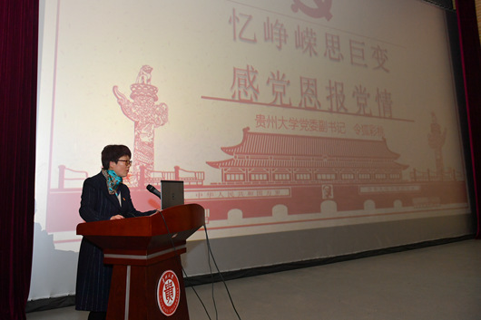 贵大新闻网讯 4月15日晚,校党委副书记令狐彩桃以“忆峥嵘思巨变 感党恩报党情”为题,在西校区图书馆多功能报告厅为我校家庭经济困难学生党员上专题党课。学生工作部、校团委等部门相关负责人,学生资助管理中心全体职工、各学院带队党员教师、全校在读本科生贵州省建档立卡教育精准扶贫党员同学、国家励志奖学金全体党员共300余人聆听党课。