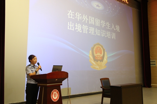 贵阳市公安局出入境管理分局刘君警官给留学生新生做出入境管理法律法规教育,包括与留学生在华生活息息相关的签证及居留许可的办理、逾期处理办法、住宿登记等内容。