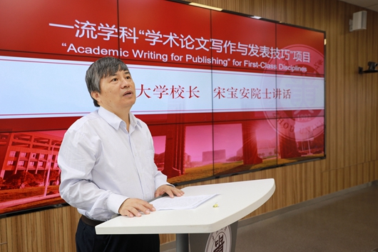 宋宝安致辞。他表示,学校教师工作处要着眼国际化、学校一流学科建设,采取“请进来、走出去”的方式,帮助全校教师提高英文学术论文写作能力,更好地在国际期刊,尤其是国际知名学术期刊发表学术科研成果。他希望参训教师珍惜学习机会,为贵大的学科建设作出贡献。