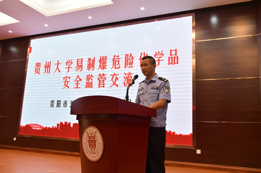 贵阳市公安局花溪分局治安大队副大队长吴可镂作易制爆药品管理专题报告,从解答为什么管、怎么管、不管会怎样三个问题,诠释了易制爆药品管理的重要性。