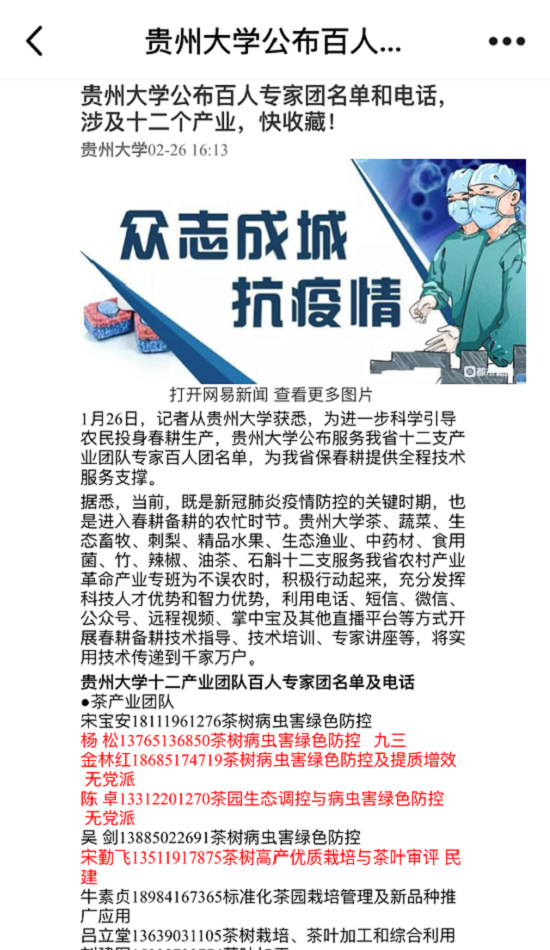 农工党党员、我校油茶产业团队负责人周运超教授通过视频、电话等方式指导贵州油茶产区黔西南、威宁油茶生产工作,并制作视频教学内容提供给相关油茶生产经营单位作技术指导;无党派人士陈卓教授积极参与天眼新闻APP教育频道推出的《春耕掌中宝》栏目,将农技服务送“进”手机,送到百姓眼前;无党派人士金林红教授是我校茶产业团队负责人,在接到普安县楼下镇明诚茶场负责人韩红林电话后,带领团队前往基地现场查看,对茶场基地存在的问题,提出具体解决方案,并免费提供物资。韩红林说:“没想到一个电话,这些专家学者就真真实实的来到了我们面前,不仅帮我们解决当下的问题,还给我们未来发展提供了帮助、提供了思路,太感谢他们了。”