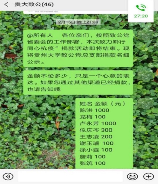 贵大新闻网讯(统战部 王颖红 报道|摄影 李红香)捐款捐物,奉献爱心。为全力支援武汉疫情防治工作,贵州大学民主党派教师们积极行动,捐款捐物,汇聚涓涓力量。据初步统计,截至3月上旬,我校民主党派代表人士共捐款85370元,其中民革贵大委员会捐助8600元;民盟贵州大学委员会捐助38450元;民建贵大支部捐助2500元;民进贵大花溪支部捐助7400元;致公党贵大总支捐助5200元;九三学社贵大各支社通过王选关怀基金捐助15700元;农工党贵大第一支部捐助2220元;农工党贵大第二支部捐助6400元,此外,还捐赠了口罩5000个、消毒液23桶、喷壶9个及手套1500个。所捐款项及物资均以不同方式不同渠道送抵防控一线。