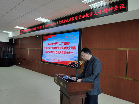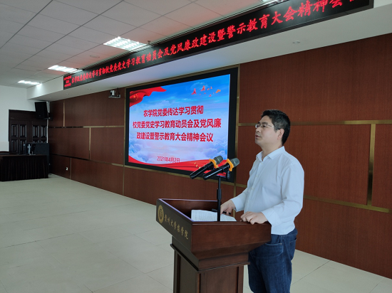 贵大新闻网讯(农学院党政办供稿)4月2日,农学院在崇学楼339会议室召开传达学习贯彻校党委党史学习教育动员会及党风廉政建设暨警示教育大会精神会议。学院党政领导、全体教师党员及学生党员代表、教师代表参加会议,会议由院党委副书记、院长潘学军主持。