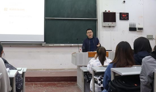 贵大新闻网讯 (数学与统计学院 饶沫可 报道|摄影 张卓琅)4月8日,数学与统计学院数学系主任章超在东校区逸夫楼204DT教室为2018级130余名备战考研学生做复习进度规划讲座。