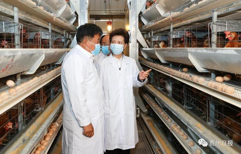 谌贻琴在盘州市贵州韩伟蛋业有限公司考察鸡舍车间,了解自动化养鸡及鸡蛋分拣情况