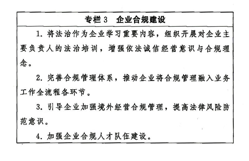 深化依法治企。深化“法律进企业”,落实经营管理人员学法用法制度。加强企业法治文化建设,提高经营管理人员依法经营、依法管理能力。推动企业合规建设,防范法律风险,提升企业管理法治化水平。