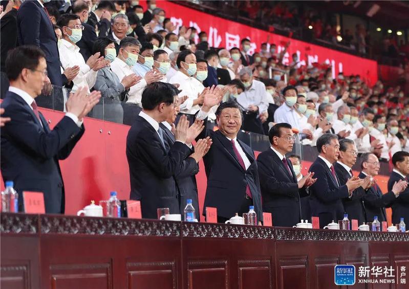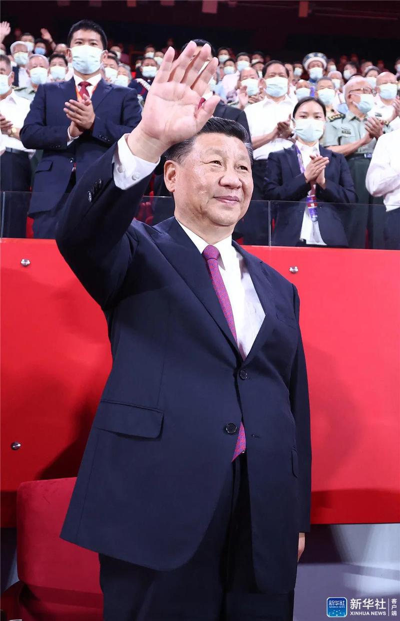 6月28日晚,庆祝中国共产党成立100周年文艺演出《伟大征程》在国家体育场盛大举行。习近平、李克强、栗战书、汪洋、王沪宁、赵乐际、韩正、王岐山等党和国家领导人,同约2万名观众一起观看演出。新华社记者 鞠鹏 摄