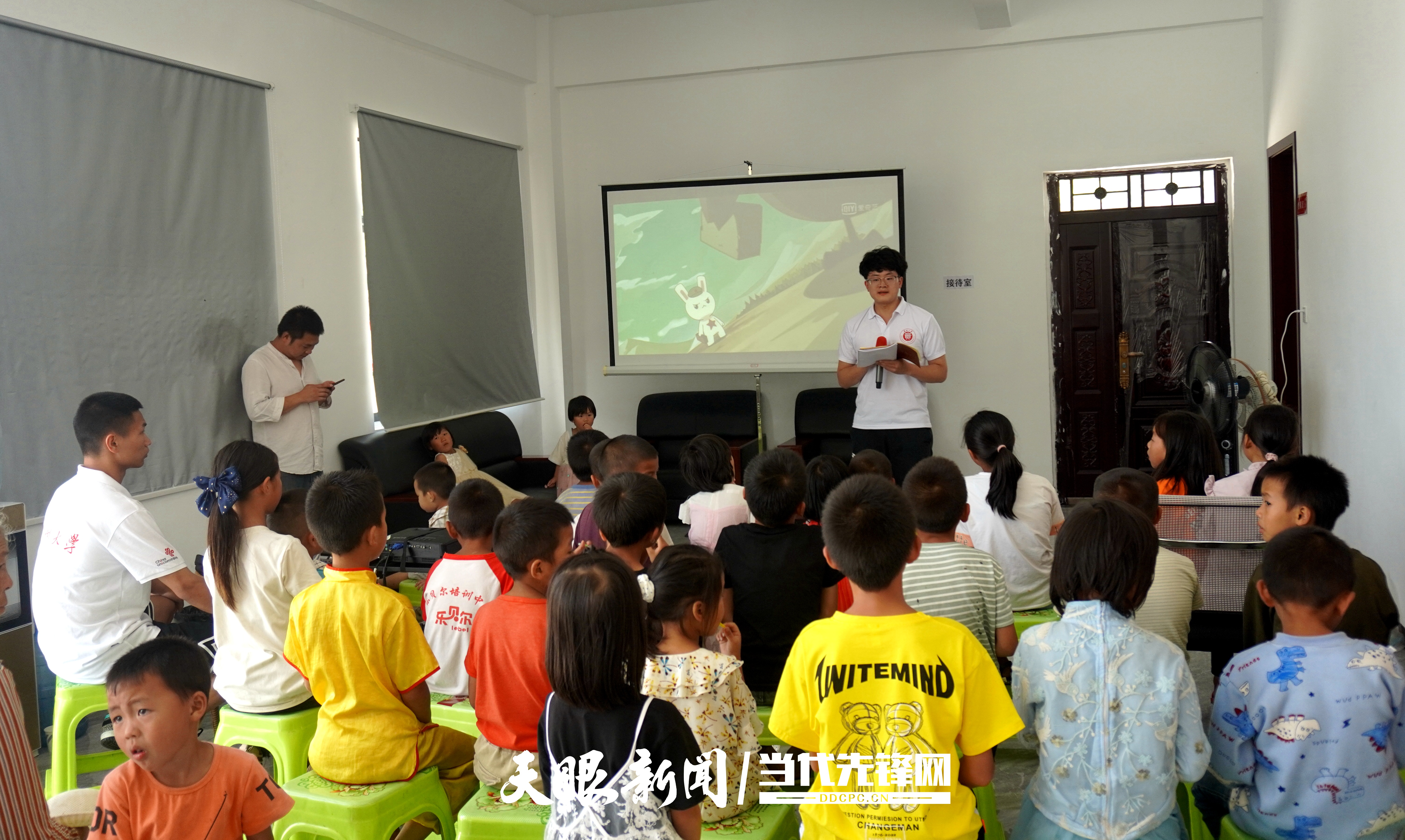 7月20日,在贞丰县者相镇董箐村,来自贵州大学旅游与文化产业学院的10名本科生在村活动室向董箐村40余名暑期在家儿童进行爱国文化教育,并组织孩童做游戏,共同为刚满7岁的潘国娟过生日,现场洋溢着孩童们的欢声笑语。