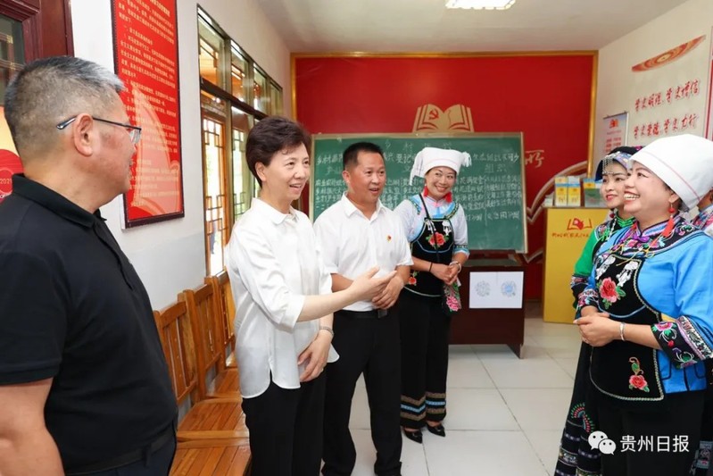 谌贻琴在贵定县盘江镇红旗村新时代文明实践站与少数民族群众亲切交谈