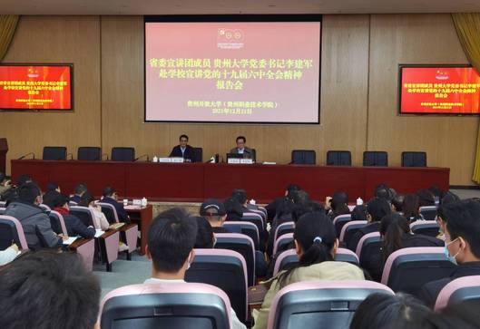 12月21日,学习贯彻党的十九届六中全会和省委十二届十次全会精神宣讲报告会在贵州开放大学(贵州职业技术学院)举行。省委宣讲团成员、贵州大学党委书记李建军作宣讲报告。贵州开放大学(贵州职业技术学院)党委书记宋广强主持宣讲报告会。