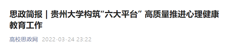 贵州大学积极探索大学生心理健康教育工作的新思路、新途径,始终坚持“用爱育心,解学生困惑,助学生阳光成长”的初心和使命,以“加强大学生心理健康教育,优化大学生心理品质,促进大学生健康成长和全面发展”为工作目标,着力构筑“六大平台”,高质量推进心理健康教育工作。
