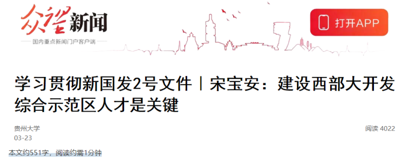 当前贵州大学正通过不断的创新人才体制机制,建立健全现代大学的治理能力和治理体系,积极搭建人才干事创业的平台。目前贵州大学国家级高层次人才的总量占了全省的30%以上,因此面对新国发2号文件的重大机遇,贵州大学一定要立足区域,回应和服务国家与贵州重大发展战略需求,立足贵州建一流,以高水平的学科平台和人才团队为抓手,用学科链对接产业链,用人才链对接创新链,用知识链对接服务链,构建大团队、争取大项目、产出大成果、培养大人才,全力以赴助力建设西部大开发综合改革示范区建设。