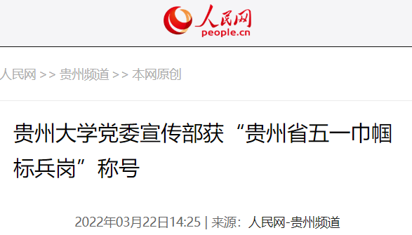3月22日,记者从贵州大学获悉,近期贵州省总工会表彰了一批女职工先进集体和个人,其中,贵州大学党委宣传部获“贵州省五一巾帼标兵岗”荣誉称号。