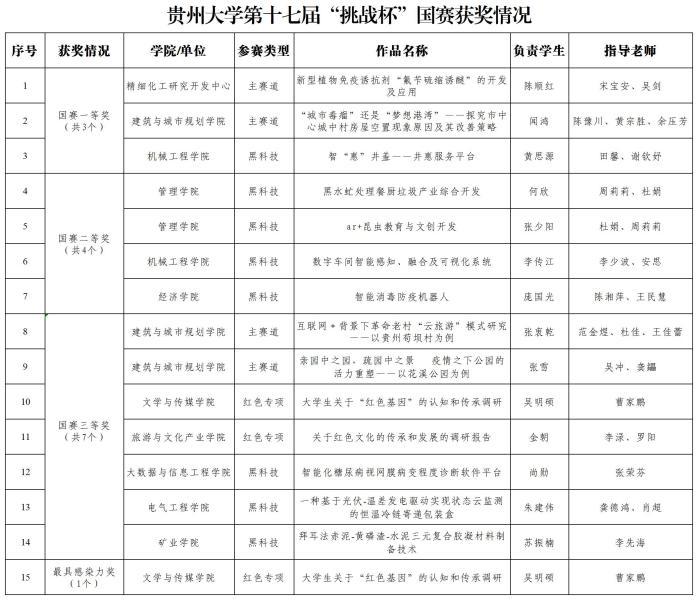 据了解,《互联网+背景下革命老村“云旅游”模式研究——以贵州苟坝村为例》《亲园中之景,疏园中之人\后疫情时代公园活力重塑——以贵阳市花溪公园为例》两作品分别获决赛三等奖。此前我校机械工程学院《智“惠”井盖——井惠服务平台》获本届挑战杯“黑科技”赛道一等奖,至此,第十七届“挑战杯”我校共获得全国一等奖3项、二等奖4项、三等奖7项、最具感染力奖1项。