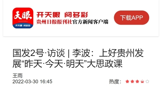 “习近平总书记赞誉‘贵州取得的成绩,是党的十八大以来党和国家事业大踏步前进的一个缩影’。”李波说,如今的贵州,天堑变通途,彻底打破原有时空格局,提升了区域发展中的战略地位;如今的贵州,深挖“钻石矿”,培育“智慧树”,推进大数据与实体经济深度融合发展,为实现弯道取直、后发赶超插上腾飞的翅膀;如今的贵州,守住生态和发展两条底线,成为世人向往的空气清新、气候凉爽、山清水秀、文化多彩的旅游胜地。