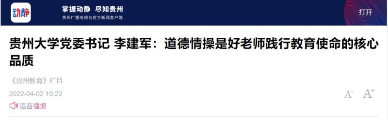 “道德情操是好老师践行教育使命的核心品质。”在《贵州教育大讲堂》——2022年春季学期开学第一课上,贵州大学党委书记李建军说:“‘教,上所施,下所效也;育,养子使做善’,教师的职业道德要求是‘爱国守法、爱岗敬业、关爱学生、教书育人、为人师表、终身学习’。教师的职业特性决定教师必须是道德高尚的人。教师的工作就是塑造灵魂、塑造生命、塑造人,最终达成向善的教育目标。”
