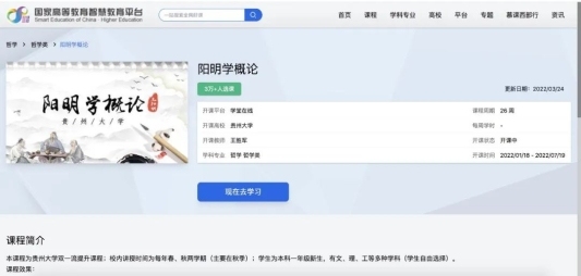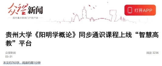 近日,由贵州大学中国文化书院编制、贵州大学出版社出版的《阳明学概论》的同步通识课程,在国家高等教育智慧教育平台上线。
