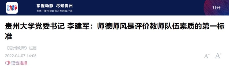 “师德师风是评价教师队伍素质的第一标准。”在《贵州教育大讲堂》——2022年春季学期开学第一课上,贵州大学党委书记李建军说:“师德师风是评价教师队伍素质的第一标准。加强师德师风建设,要坚持‘四个相统一’,就是:坚持教书和育人相统一,坚持言传和身教相统一,坚持潜心问道和关注社会相统一,坚持学术自由和学术规范相统一。”
