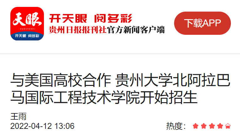 2021年11月,教育部批复设立贵州大学北阿拉巴马国际工程技术学院,为贵州大学与美国北阿拉巴马大学合作办学。该学院填补了贵州省高校以工科为主合作办学机构的空白,是两校国际合作的新里程碑。
