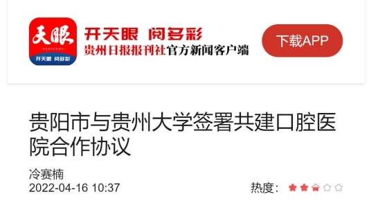 4月15日,贵阳市人民政府与贵州大学先后签署全面战略合作协议和共建贵州大学口腔医院(贵阳市口腔医院)合作协议。