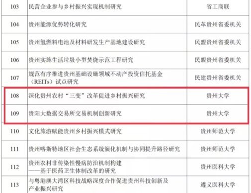 据悉,为充分发挥调查研究服务省委全面深化改革科学决策作用,贵州省委改革办按照《2022年度省委全面深化改革重大调研课题工作方案》要求,共确定2022年重大调研课题205个。我校党委书记李建军牵头的“深化贵州农村三变改革促进乡村振兴研究”、副校长漆思牵头的“贵阳大数据交易所交易机制创新研究” 获得立项。