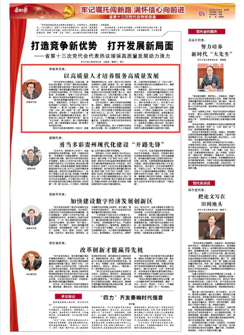 “党代会报告立意高远、内涵丰富,具有历史的高度、时代的广度和现实的维度,以宏阔的视野全面审视了贵州的发展大势,准确把握了贵州高质量发展的要求和人民群众对美好生活的期待。听了报告之后,倍感振奋,深受鼓舞。”省第十三次党代会代表、贵州大学党委书记李建军对记者说。
