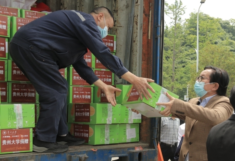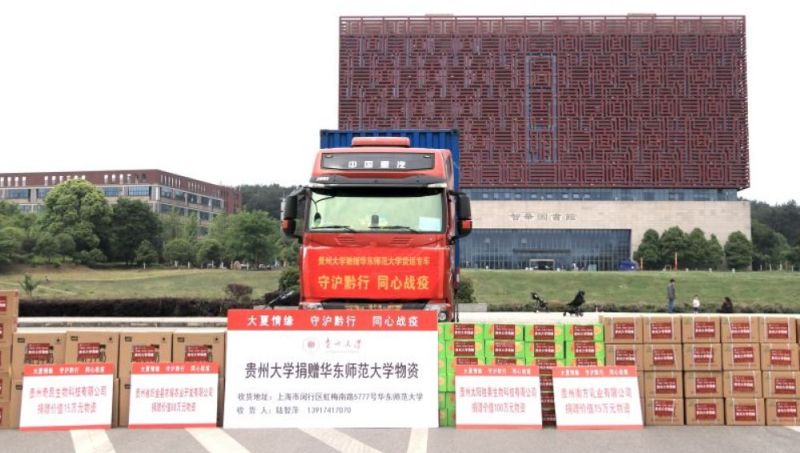 5月6日上午,随着贵州大学党委书记李建军的一声指令,装载着贵州大学向华东师范大学捐赠抗疫物资的车辆驶出校园。2300盒刺梨原液、3000件纯牛奶、1222箱纯南瓜面条……共28.6吨总价值约218万元的抗疫物资将运送至华东师范大学。
