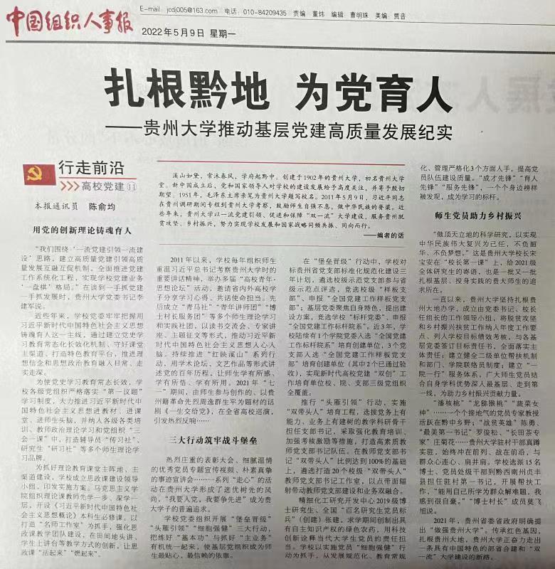 “我们围绕‘一流党建引领一流建设’思路,建立高质量党建引领高质量发展互融互促机制,全面推进党建工作系统化工程,实现学校党建业务‘一盘棋’格局。”在谈到一手抓党建一手抓发展时,贵州大学党委书记李建军说。