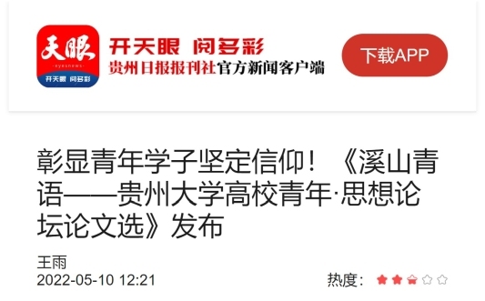 《溪山青语——贵州大学高校青年·思想论坛论文选》一书正式发布据介绍,《溪山青语——贵州大学高校青年·思想论坛论文选》共分为四章,第一章为“学”,内容为青年学子对习近平新时代中国特色社会主义思想的学习体会。第二章为“思”,是青年结合实际对家国情怀、责任担当的深入思考。第三章为“践”,探讨青年在投身脱贫攻坚、乡村振兴、疫情防控等过程中的实践总结。第四章为“悟”,是青年对党史学习教育重要意义的感想感悟。四个章节以学习习近平新时代中国特色社会主义思想为主线,一脉相承、承上启下、环环相扣、相得益彰。