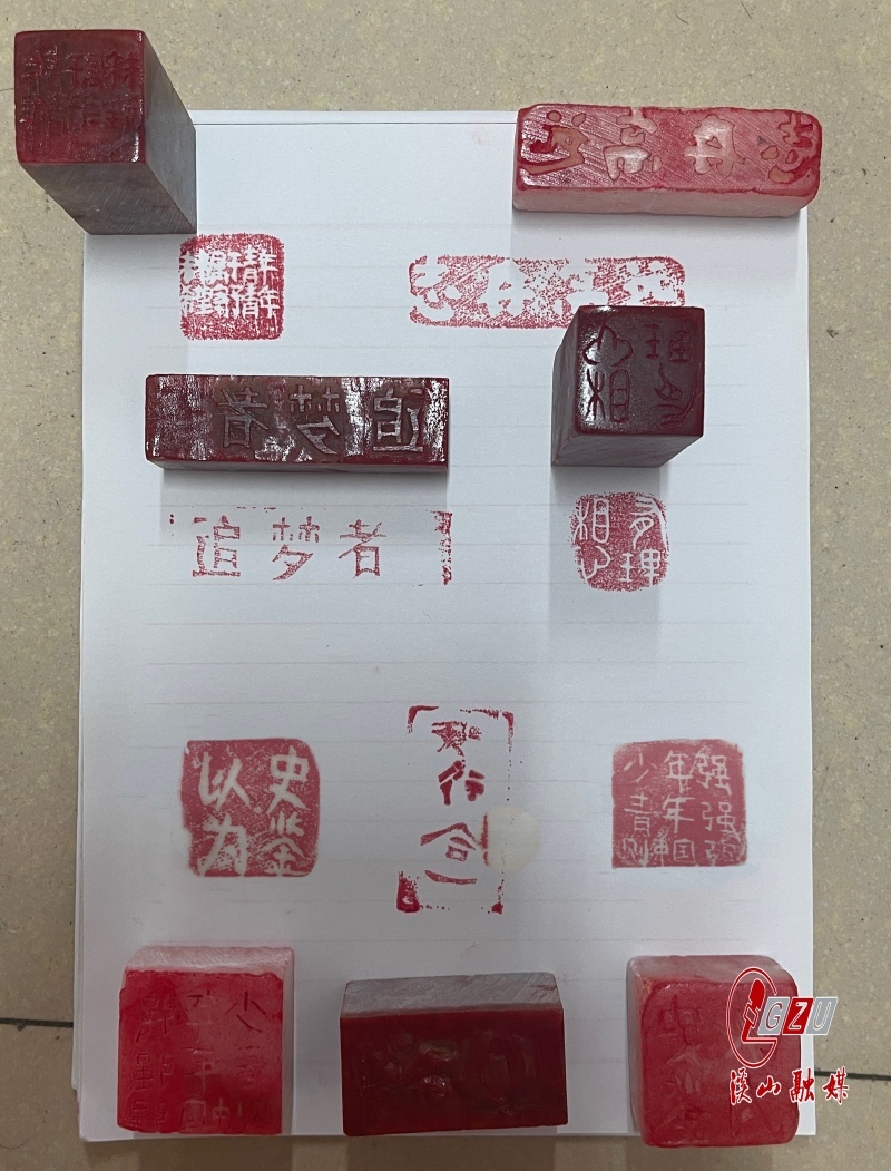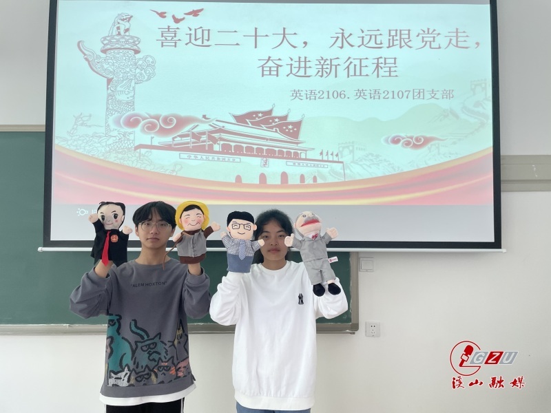 贵州大学阳明学院英语2106、2107团支部“喜迎二十大、永远跟党走、奋进新征程”5月主题团日活动中,同学们采用传统篆刻和手偶戏艺术来表达新时代青年“红心向党”的青春志向。