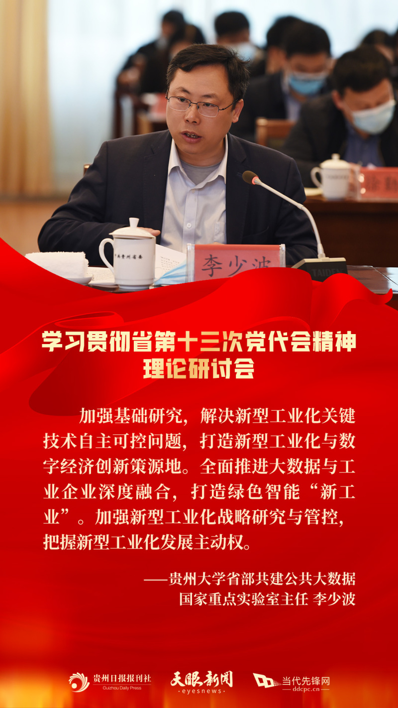 5月20日,在学习贯彻省第十三次党代会精神理论研讨会上,贵州大学省部共建公共大数据国家重点实验室主任李少波说,省第十三次党代会报告为贵州新型工业化发展提出了整体方向与路径,催人奋进。