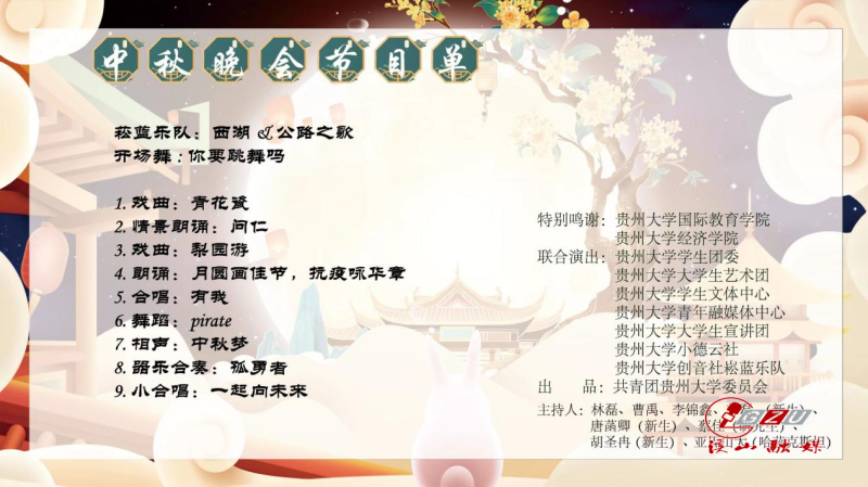 紧急筹备,精心组织。校团委一天内完成了作品选取、场景布置、服装道具、节目排练、视频录制剪辑、晚会直播等一系列工作。以大学生艺术团、学生文体中心、贵大青年融媒体中心、大学生宣讲团、学生社团等为依托,联动国际教育学院、经济学院,精选优秀学生文艺作品,为全校师生献上了异彩纷呈的双节晚会。
