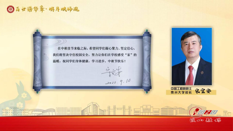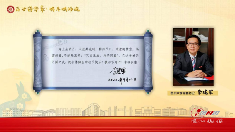 贵大新闻网讯(通讯员 刘艳春)9月10日,恰逢中国传统中秋佳节与第38个教师节,在我省新冠肺炎疫情较为严峻的形势下,为进一步团结引领广大师生凝心聚力、共克时艰,校团委在线上举办了“百廿谱华章 明月映师魂”——庆祝中秋节、教师节文艺晚会。晚会通过“贵大青年”抖音号进行全程直播。