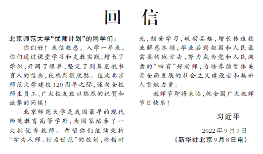 编者按:中共中央总书记、国家主席、中央军委主席习近平9月7日给北京师范大学“优师计划”师范生回信,对他们寄予殷切期望,并在北师大建校120周年和第三十八个教师节来临之际,向该校师生员工、广大校友表示祝贺和问候,向全国广大教师致以节日的祝福。日前,贵州大学组织师生学习,大家深受鼓舞,热烈讨论。