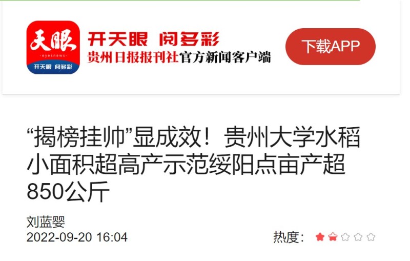 今年4月,我省启动2022年激励农业技术人员创新创业行动,激励全省各级各类农业技术人员深入生产一线开展基础性示范服务和“揭榜挂帅”项目,确保圆满完成今年粮食生产任务。贵州大学冯跃华水稻团队迅速行动,揭下了贵州省水稻小面积超高产示范的榜单,并联合绥阳县农业农村局、绥阳县小辉农机专业合作社共同实施,定下了争取实现水稻亩产850公斤的目标。